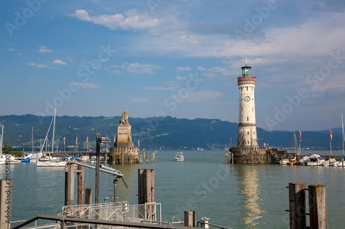 Port entrance of the harbour in the city of Lindau at the Lake Constance or Bodensee in southern Germany