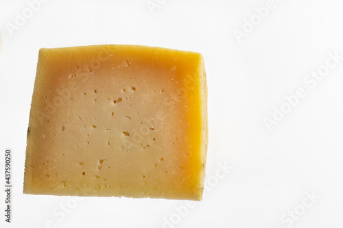 portion of cured manchego cheese on white background. Horizontal shot