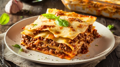 Portion of traditional italian lasagne/lasagna on white plate