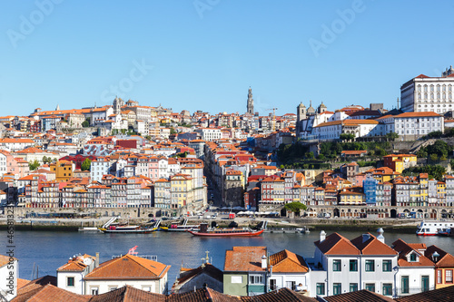 Porto Portugal old town buildings World Heritage with boat ship Douro river travel