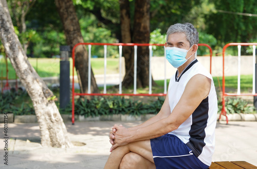 portrait an old man wearing protective face mask, sitting social distancing in the park after exercise, concept new normal life during coronavirus is spreading