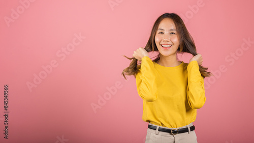 Portrait Asian attractive young woman wearing a yellow shirt with long hair is smiling and holding her hair back in studio shot isolated on pink background, so happy and funny cute girl
