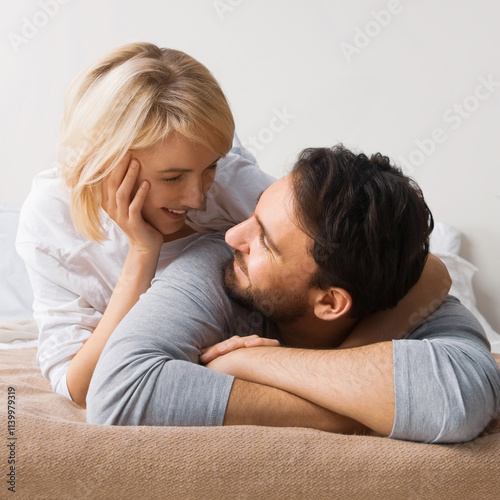 Portrait image - young playful couple looking at each other, lay on bed. Blond cute woman, brunette bearded man in love, relationship, dating, happy family, comfortable rest time concept. Square.