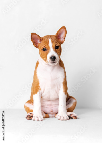 Portrait of 8 week old red Basenji puppy sitting on white background and looking at camera