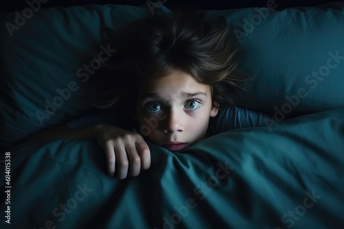 Portrait of a 10 years old kid lying down on the bed, face scared, dark mood, looking at camera from directly above.