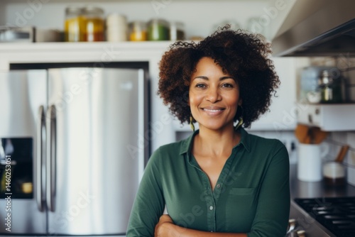 portrait of a african american middle age fitwoman standing infront of open fridge with healthy food with slightly messy modern apartment in the background in usa
