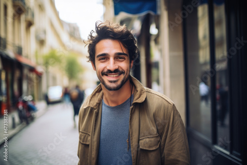 Portrait of a attractive smiling man standing on the city street in Paris