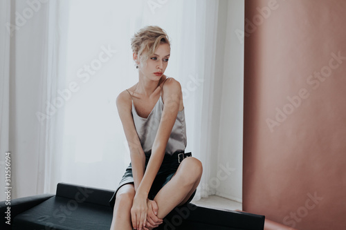 portrait of a beautiful fashionable blonde woman on a black office sofa