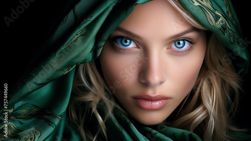 Portrait of a beautiful girl with blue eyes wearing a foulard scarf on her head