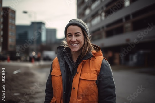Portrait of a beautiful smiling woman in an orange jacket on the street