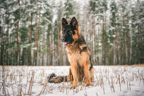 Portrait of a beautiful thoroughbred long-haired shepherd dog in the winter forest.