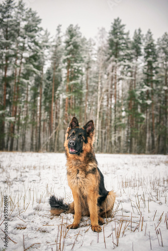 Portrait of a beautiful thoroughbred long-haired shepherd dog in the winter forest.