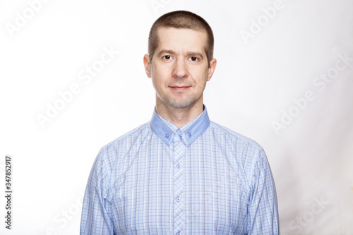 portrait of a confident calm, strict man, in a blue classic shirt; look into the camera. Isolated