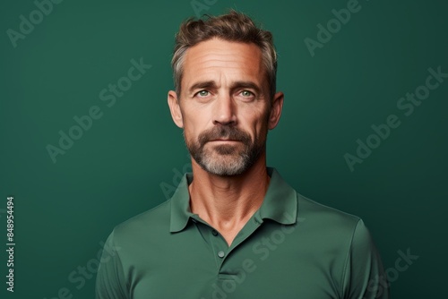 Portrait of a content man in his 40s wearing a breathable golf polo isolated in solid color backdrop