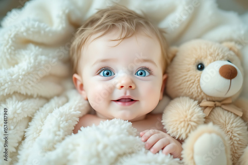 Portrait of a cute baby lies on bed covered by a fluffy beige blanket accompanied by a plush teddy bear dolls