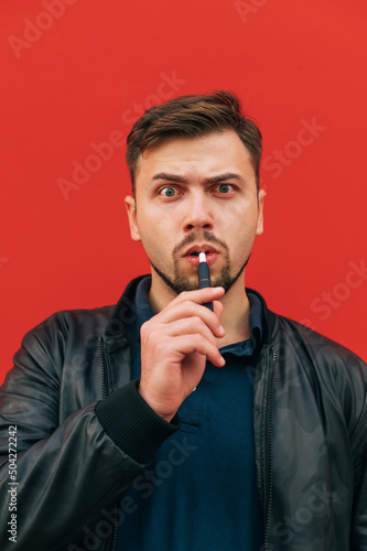 Portrait of a funny man in dark clothes smokes an electronic cigarette on a red background and looks at the camera. Vertical