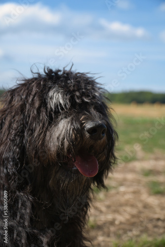 Portrait of a Goldendoodle dog. Fluffy, curly, long, black light brown fur. Dog