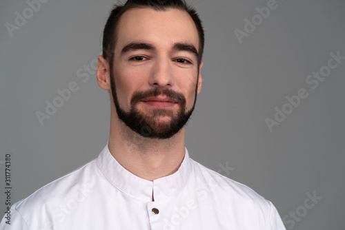 Portrait of a handsome bearded guy in white clothes on a gray background.