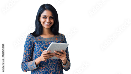 Portrait of a happy beautiful indian woman smiling and holding a tablet isolated on transparent background. png