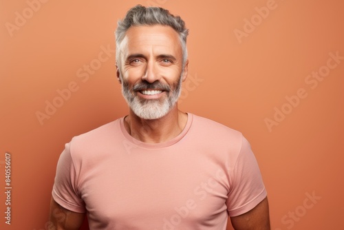 Portrait of a happy man in his 50s donning a trendy cropped top in front of pastel brown background