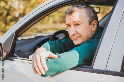 Portrait Of A Happy Mature man Driving Car To Go To Work or travels. Concept of automobile and popular hobby
