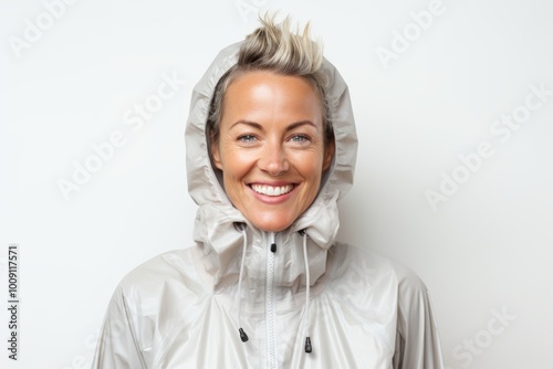 Portrait of a happy woman in her 40s wearing a lightweight packable anorak isolated in white background
