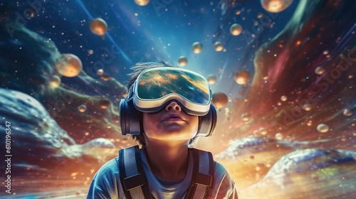 Portrait of a Little boy wearing virtual reality goggles.Generative Ai