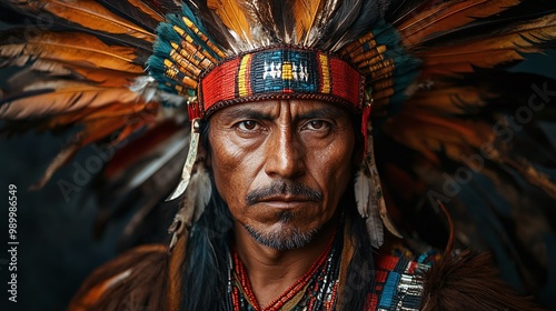 portrait of a man in traditional aztec warrior attire dressed as moctezuma the general featuring a feathered headdress and ceremonial armor symbolizing the powerful leadership of the aztec empire