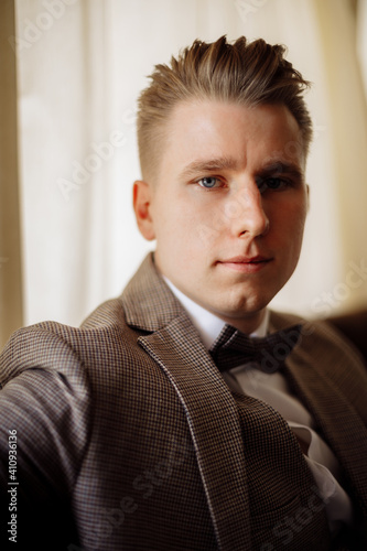 Portrait of a man. The groom in a in a gray suit, white shirt and a bow tie is sitting on a brown leather couch. Groom in a suit sitting on the couch
