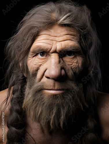 portrait of a Neanderthal man isolated on a black background.