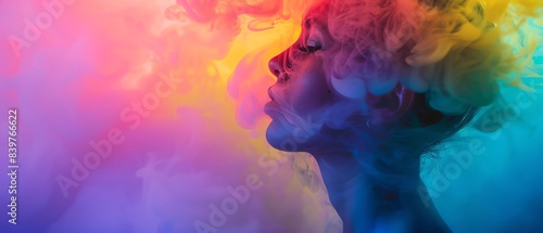 Portrait of a person, LGBTQ advocate, with rainbow smoke framing their profile, symbolizing pride and visibility in the community