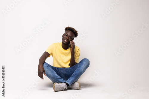 Portrait of a smiling afro american man sitting on the floor talking on the phone isolated on a white background
