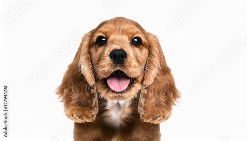 笑顔のアメリカンコッカースパニエルの子犬のポートレート(Portrait of a smiling American Cocker Spaniel puppy on white background)