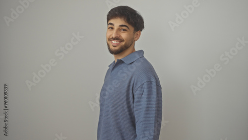 Portrait of a smiling young man with a beard wearing a blue shirt against a white background