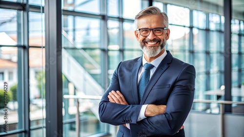 Portrait of a successful mature businessman wearing glasses and business suit, smiling with crossed arms inside a contemporary modern office environment