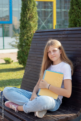Portrait of a teenage schoolgirl on the street holding notebooks. She's smiling, happy. Concept education