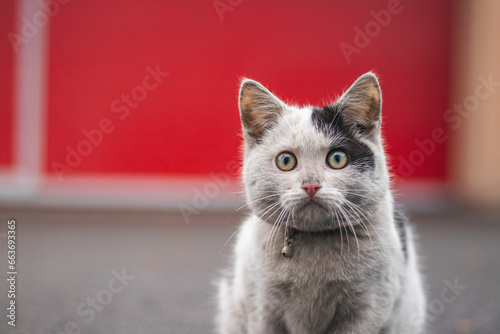 Portrait of a white and black kitten with a bell exploring its surroundings. Cute pet with a youthful, imprudent expression. Childlike curiosity