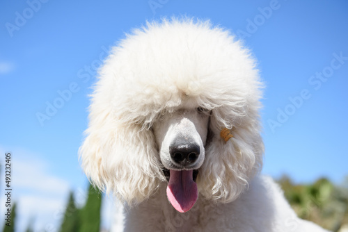 Portrait of a white grand poodle dog breed against a blue sky.