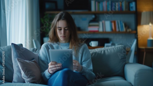 Portrait of a woman using laptop and a phone and checking email or news online while sitting on sofa at home. Searching for friends in internet social networks or working on computer. Copy space.