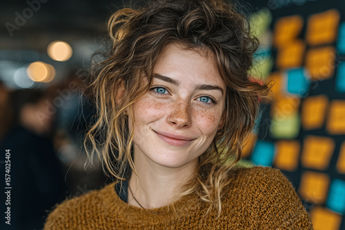 Portrait of a woman with freckles and curly hair emphasizing ethical corporate responsibility