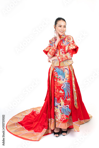 Portrait of a young asian Chinese female lady model wearing red traditional vintage wedding dress costume smiling and posing with different poses and gestures