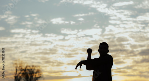 Portrait of a young Asian man in sports clothes jogging in the morning. man running at sunrise health care