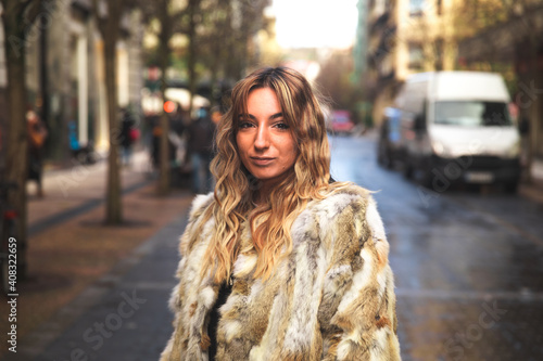 Portrait of a young caucasian blonde woman on the street with a big coat