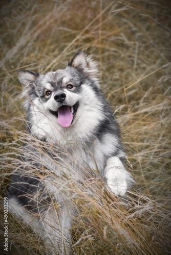 Portrait of a young Finnish Lapphund dog outdoors in nature