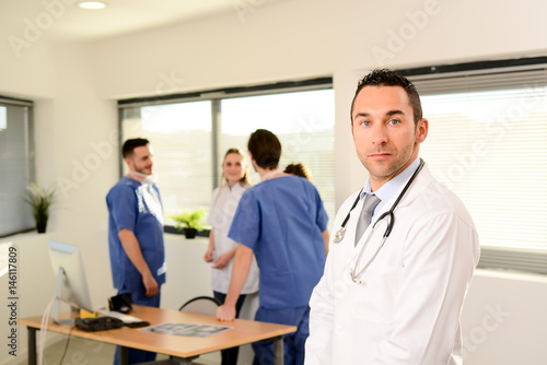 portrait of a young male doctor in hospital office with medical team in background