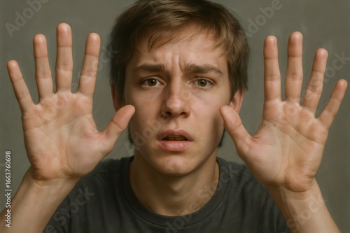 Portrait of a young man showing both hands pressing against a transparent surface, with a worried facial expression
