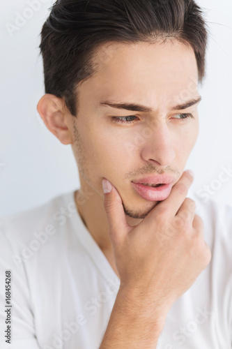 Portrait of a young man with dark hair and light eyes. on a white background. The guy in the white T-shirt. Male model.