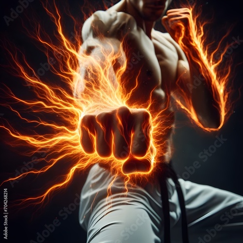 Portrait of a young martial arts man with a muscular body and energy flowing out of fists on a black background, martial arts power energy concept