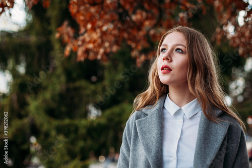 portrait of a young pretty woman in a coat on an autumn background. copy space