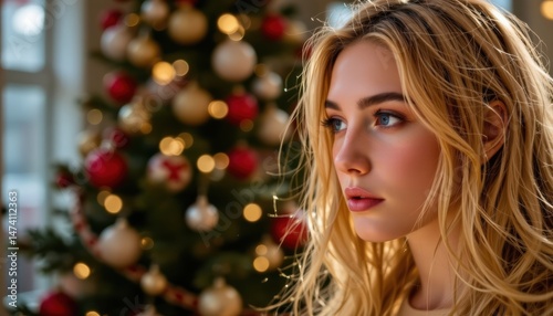 Portrait of a Young Woman with Blonde Hair and Soft Makeup, Sitting Near a Christmas Tree with Lights